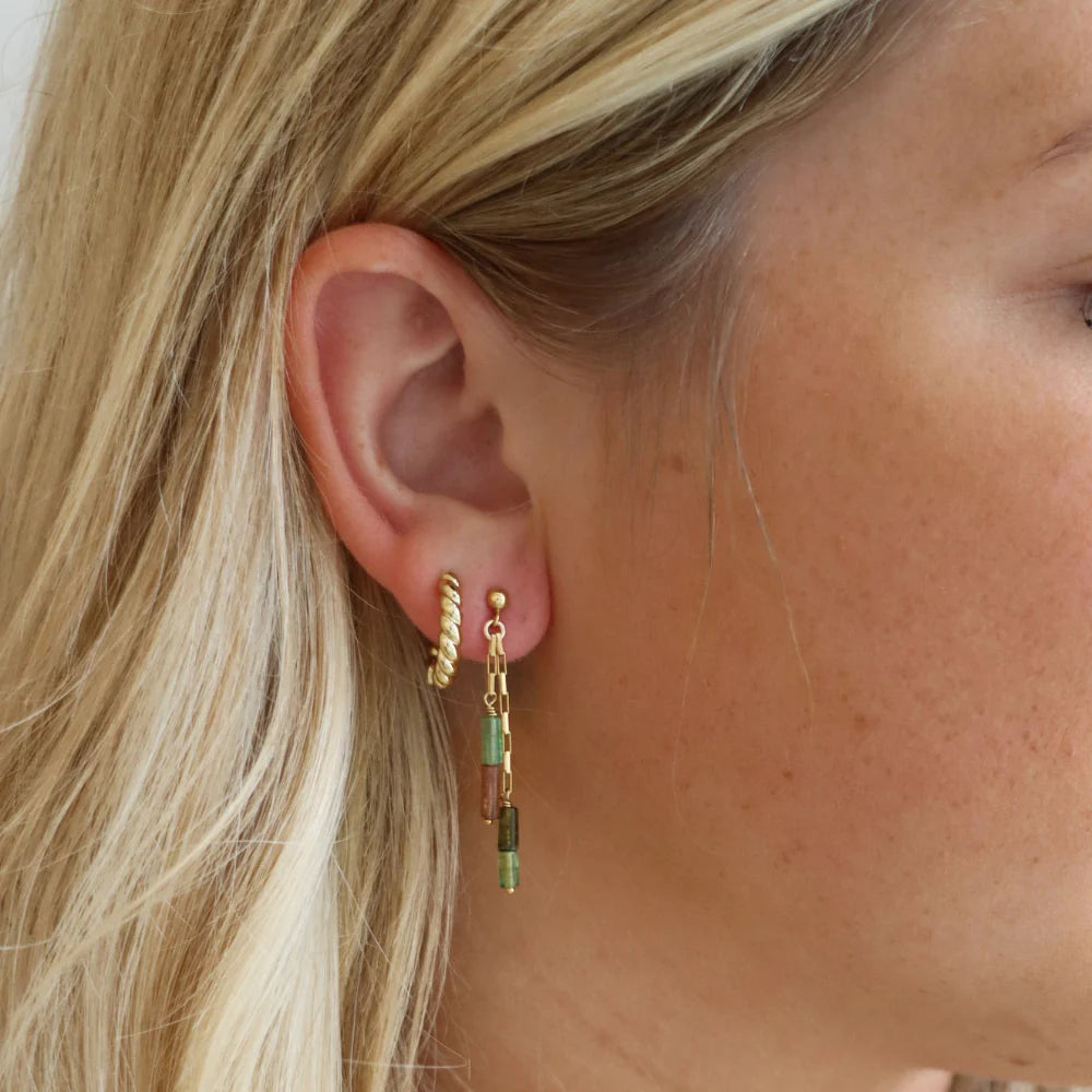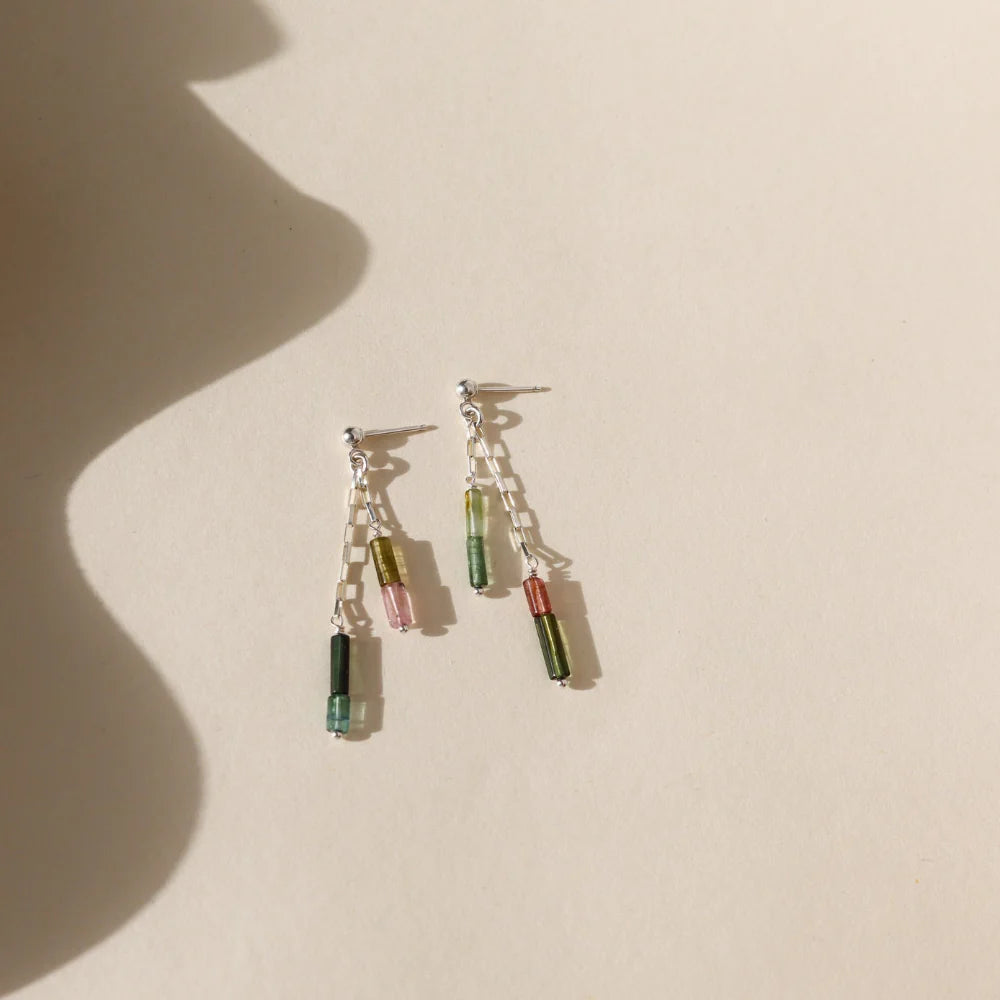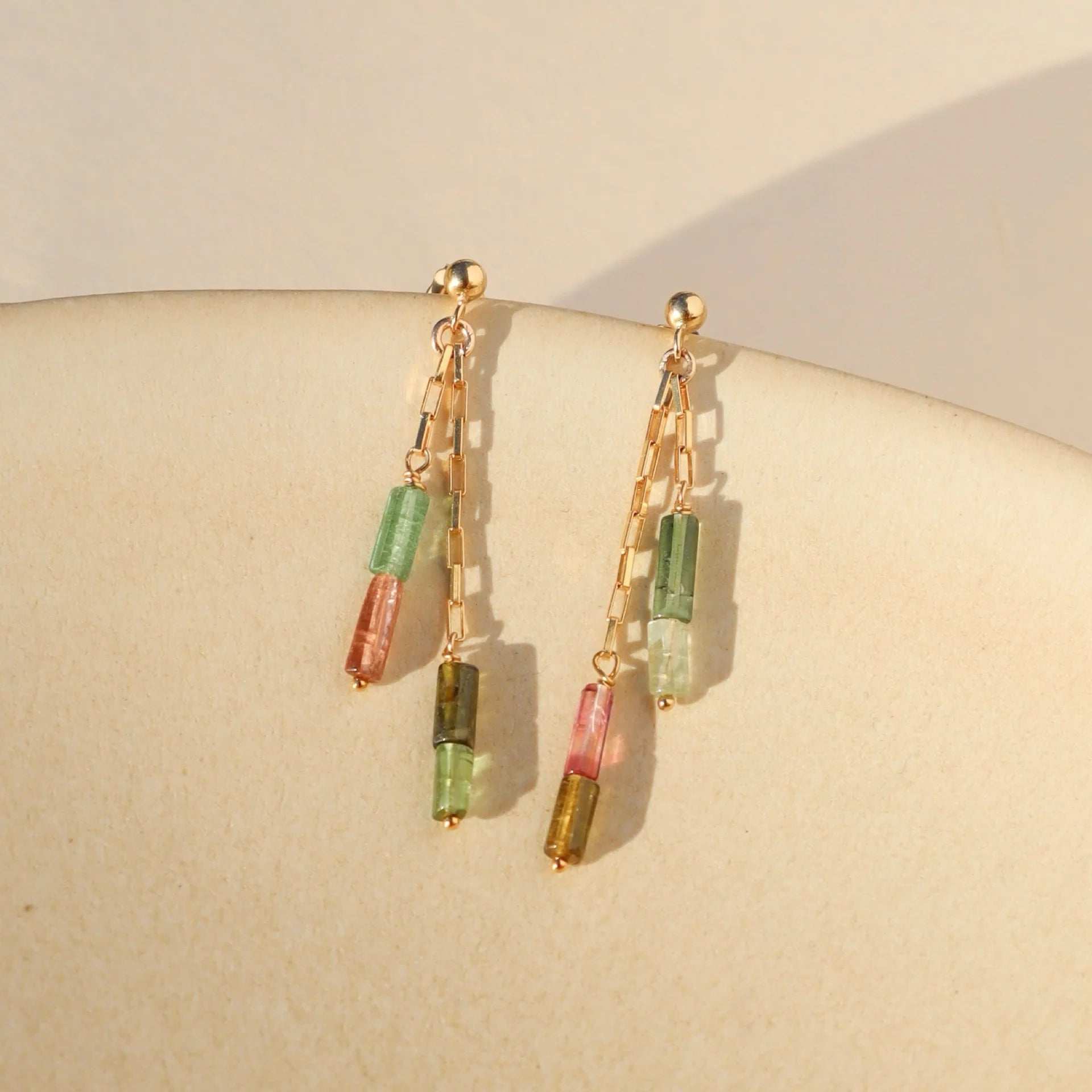 Movement, color, and individuality—captured in every pair. The Tourmaline Prism Drops feature cascading natural tourmaline gemstones, each one uniquely colored by the earth. No two pairs are ever the same.